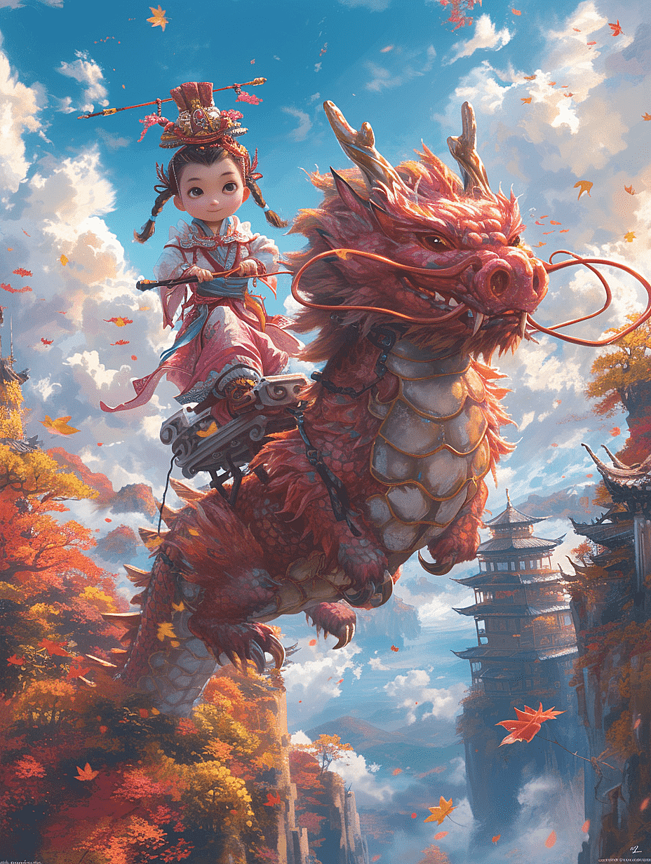 Ai绘画作品 24年1月30日 编辑 叶少侠官方认证 取消关注 关注 私信 梦幻插画风格下,一位中国小男孩骑在巨大神兽上,形象栩栩如生。这是一幅用ZBrush打造的生动卡通形象,色彩明亮大胆,如同从天际云端飞翔而来。在这幅画面中,我们看到了传统技艺与现代创意的完美融合,以及超现实的云景背景,给人以空灵飘渺之感。角色的夸张漫画风格,使整个画面充满了魔幻的色彩。绘画关键词相关文章:在视频通话中,一款由人工智能打造的个性化男生头像充满活力的春节庆典,3D卡通小学生两只可爱的龙面对面,地上摆放着饺子,弥漫着中国新年的气氛一位公主采用鲜活的插画风格,搭配采用柔和的粉紫色风格 给TA打赏 共{{data.count}}人人已打赏 Midjourney古风可爱男孩