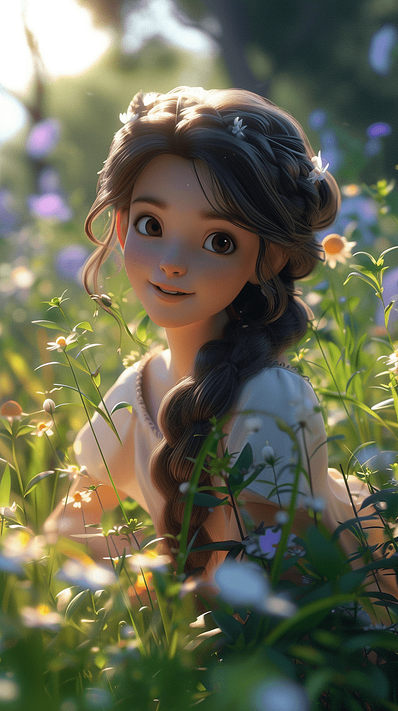 一个三维动画女孩,快乐地坐在花园里,远处可以看到丰富多彩的角色群,充满了迪士尼风格的内容世界。这个场景比例为9:16,适合手机屏幕观看。