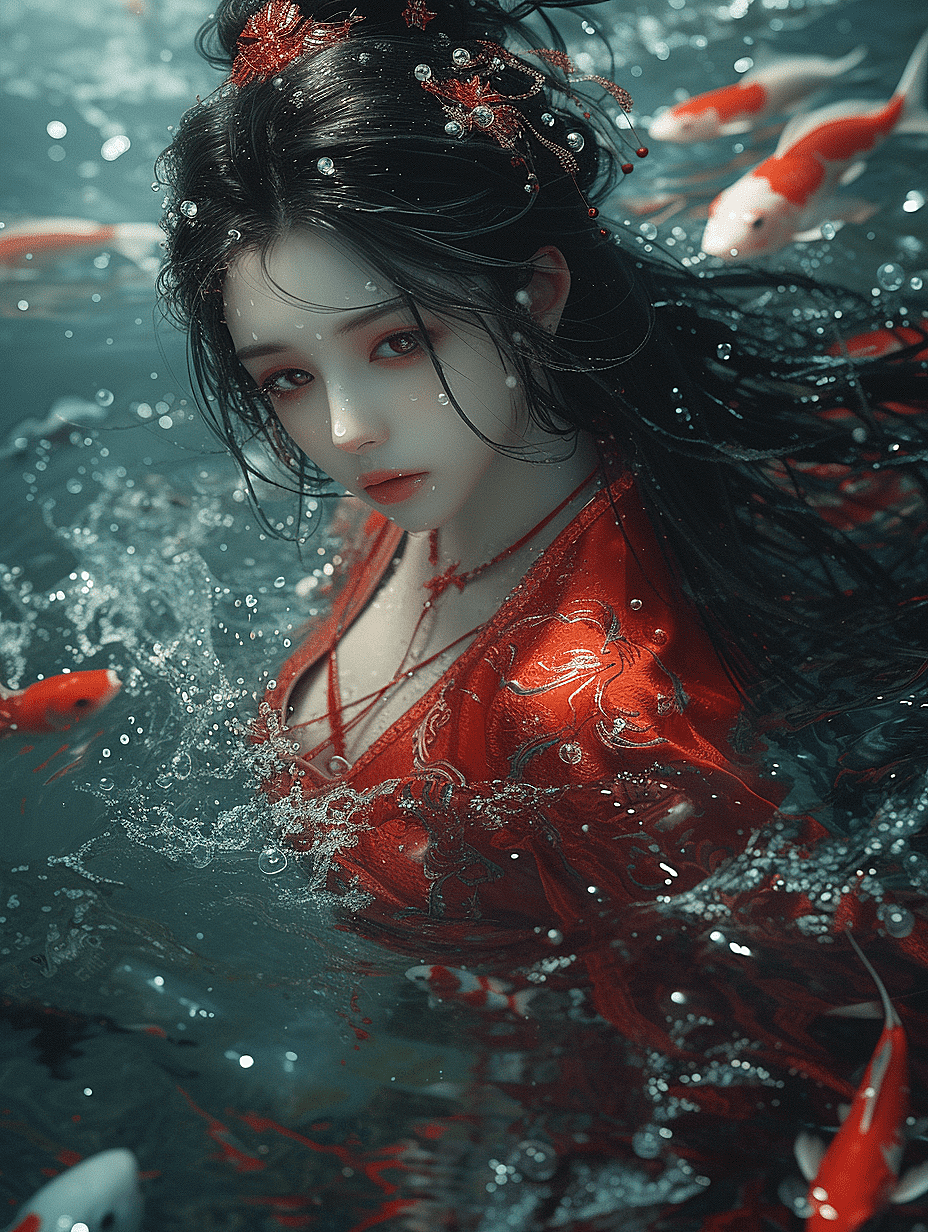 一位长发美女身着红色长裙,黑发在海水中轻轻飘散。她沉浸在碧蓝的海水之中,几只小鱼在她面前畅游,周围还有些气泡缓缓上升。