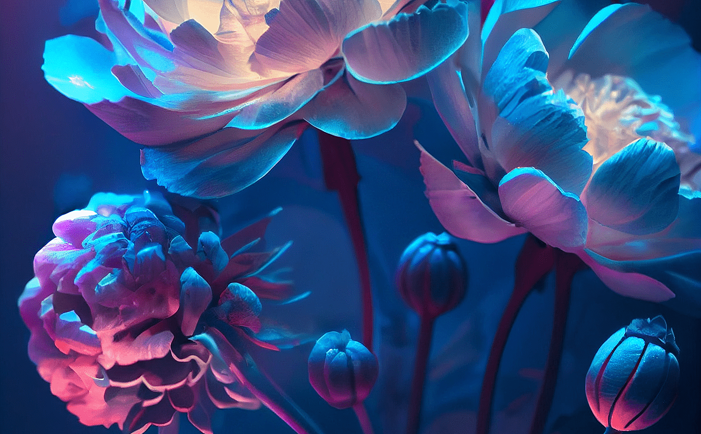 超细节 灯光下 唯美的淡蓝色 粉色牡丹花