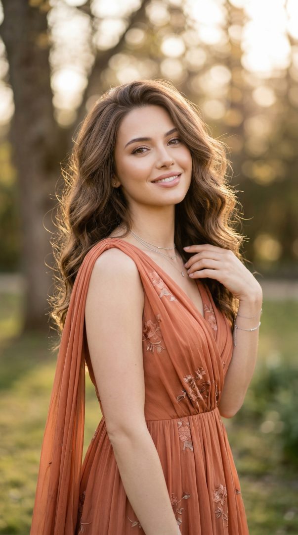 这幅壁纸呈现了一位棕色长发女子的精致特写肖像,她身着优雅长裙展露柔和微笑。画面采用温暖柔和的自然光线,细腻勾勒出柔美的面部轮廓与发丝细节。整体以暖色调为主,营造出温馨宁静的视觉氛围,高精度4K画质完美呈现肌肤质感与服饰纹理。适合用作手机锁屏或主屏幕壁纸,能为日常界面增添一抹温柔优雅的艺术气息。